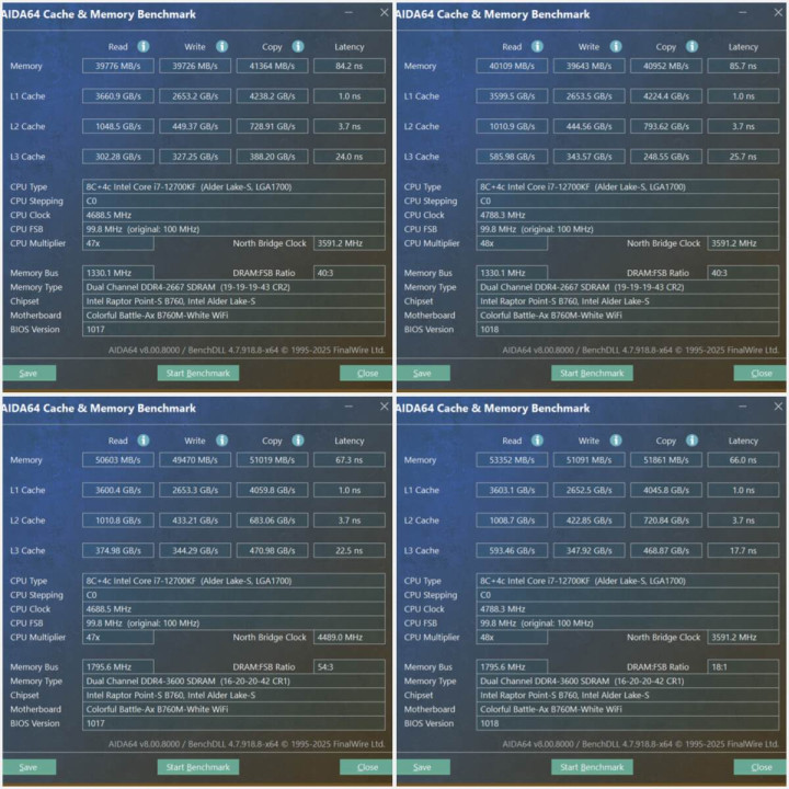 主板BIOS升级后,内存的读写有了进一步的提高,七彩虹应该又对DDR4内存支持进行了优化,升级BIOS后的测试结果如下: