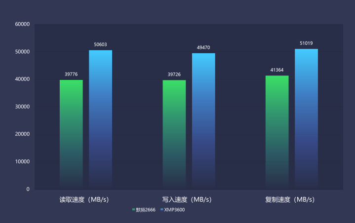 ▼开启XMP之后汉存玄麟会在3600MHz模式下运行,最终测试结果如下,读取速度50603MB/s,写入49470MB/s,复制51019MB/s,延迟67.3ns。