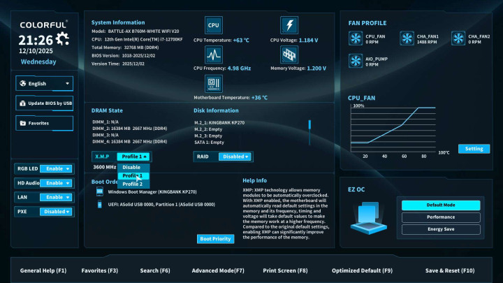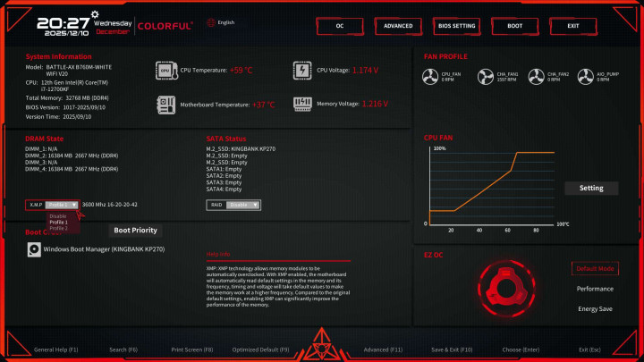 ▼刚刚的测试是内存在默频条件下运行的,想要真正发挥内存的全部性能,我们需要在主板BIOS中启用XMP配置文件,加载后开启3600MHz、CL16-20-20-42预设参数。