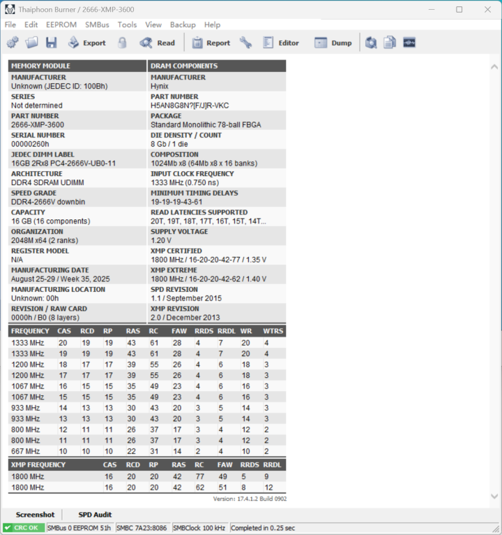 ▼通过Thaiphoon查看汉存玄麟的颗粒情况,可以看到PART NUMBER为H5AN8G8N?[F/J]R-VKC,通过与网络查询与信息比对,基本可以确认是海力士的新CJR颗粒。