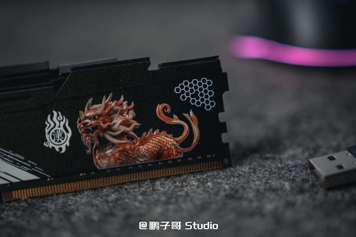 ▼国风气息相当浓郁,一只火红的麒麟印制在内存条的右边,汉存的「漢」字也被国风元素包裹起来,高精度激光打印的效果杠杠的。