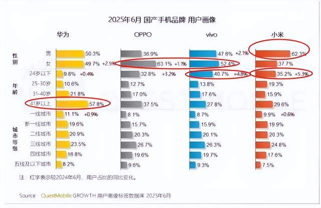 最近QuestMobile发布的2025年6月手机市场数据,把这五大品牌的用户画像扒了个清楚(注:分析不含苹果)。