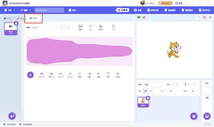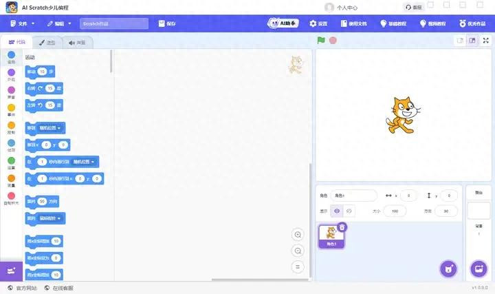 AIScratch少儿编程的界面采用经典的三栏布局:左侧是积木块分类区,中间是编程工作区,右侧是舞台预览区。整体视觉风格简洁明快,色彩搭配柔和,长时间使用不容易造成视觉疲劳。