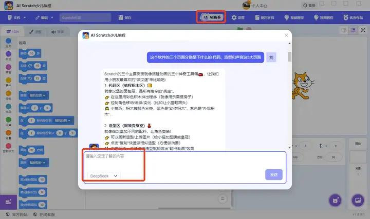 软件内置了AI编程助手,可以在孩子遇到困难时提供引导式的帮助,既能帮孩子度过卡点,又不会剥夺他们独立思考的机会。另外AI助手还能根据孩子的编程内容提供优化建议,对于有余力的孩子,这些建议能帮助他们写出更好的程序。